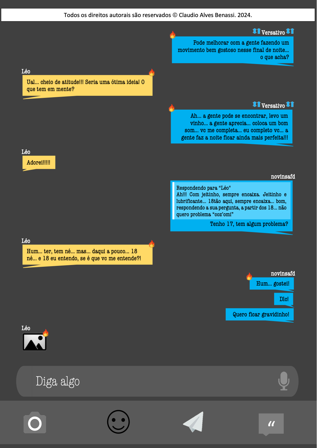 Fiquei em silêncio por alguns momentos. No fundo, já tinha um pequeno vislumbre do entendimento do porquê de certas pessoas serem tão truculentas, tão violentas... enfim, serem tão imbecis... Erick já havia me dito algo neste sentido. Mas sabia também que ao entrar no app, estaria exposto a pessoas desse tipo e a outras piores ainda... já estava começando a esgotar a minha bateria, porém as notificações ainda estavam chegando. Queria ao menos, fazer mais uma tentativa, quem sabe se no final da noite, eu não entrava no fluxo. Enfim, silenciei meus pensamentos em relação ao acontecido e voltei minha atenção para o chat.